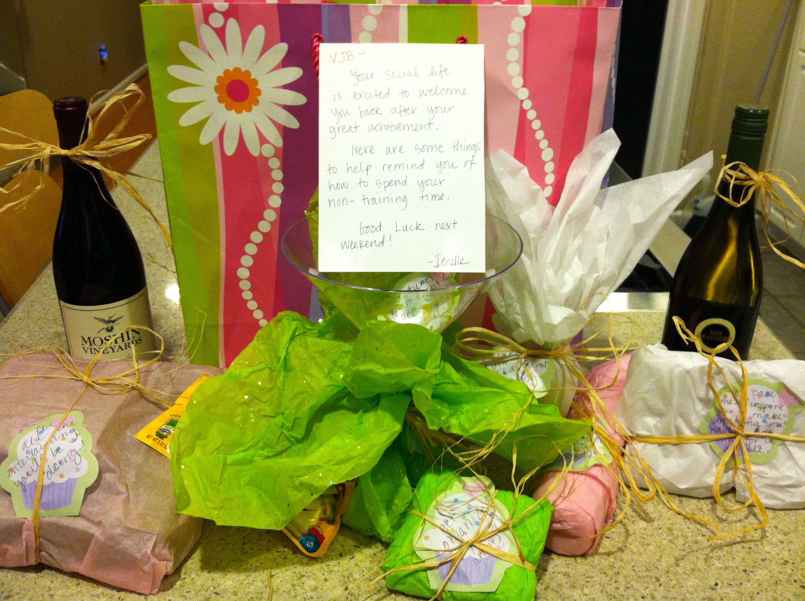 The best part of this well planned surprise (besides it being well planned and a surprise) were the personalized notes she attached to each item. I teared up as I carefully unwrapped each treasure and thought about all the things this heartfelt gesture meant. Here is a friend who really knows who I am (a vain lush) and still likes me, is so supportive (she’s patiently listened to me complain about training more than a couple of times), who took the time out of her extremely busy schedule (she works full-time, in the city, and has 2 kids and a husband) to make me feel special, and who really can’t wait to drink 2 bottles of wine with me next week (cheers- neither can I). Thank you- JBD! And to everyone else- I could get used to such treatment. (I’m just sayin’)
