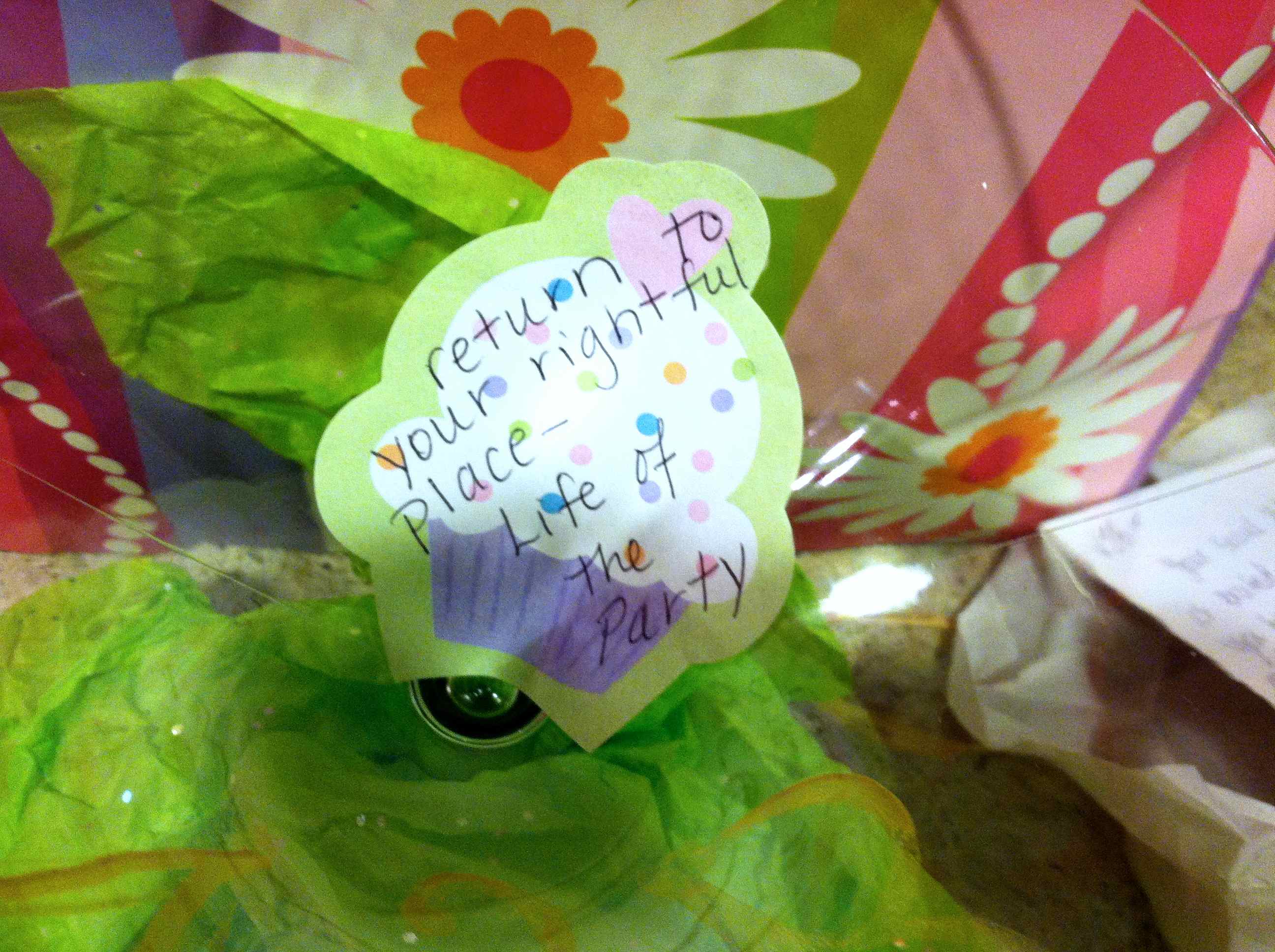 After dinner I was sitting with my ankle elevated and a glass of wine in hand, reflecting on the complexity of my 18-week journey (while also contemplating having some chocolate) when the doorbell rang. “Huh? What?” my kids, husband and I silently exchanged. After minutes of deliberation it was decided that CMB should get the door since 1) it was dark, 2) he is a strapping 6 foot tall fellow and 3) the Boogie Man might get us. What he found on the front doorstep was not a ghoul or a solicitor, but a large gift bag unaccompanied by a human being. And it was for ME!